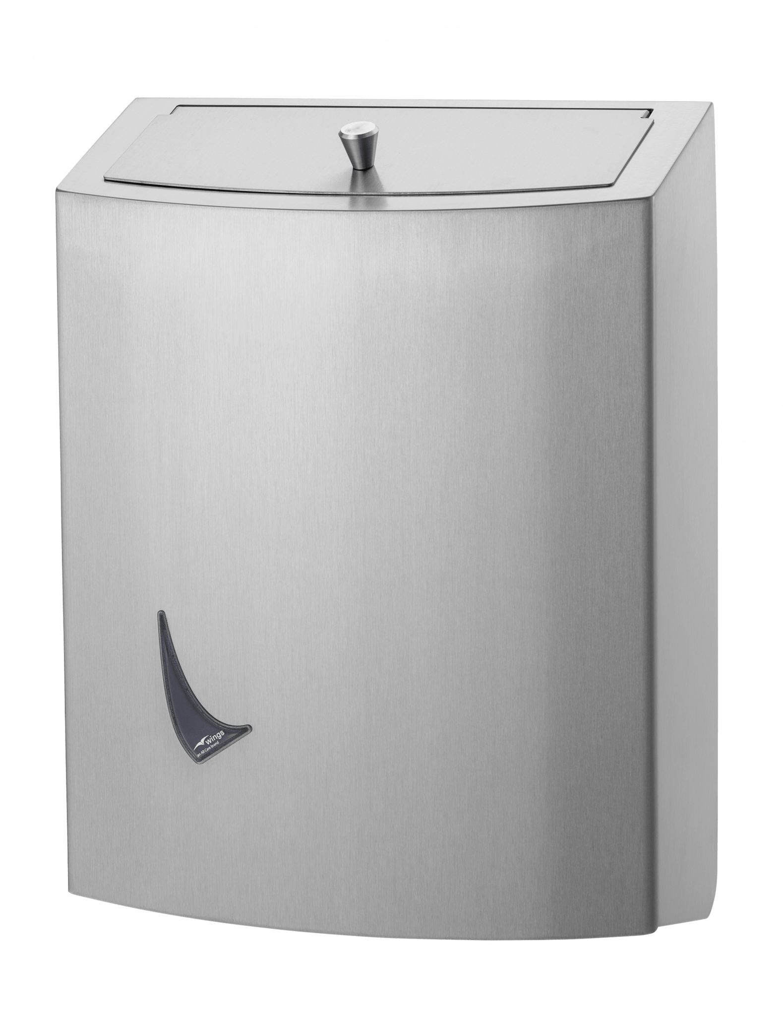 Hygiënebak 9L - RVS - Wings WIN LB9 SAL. Hygiënebak met gesloten inworpklep. Met binnenring. Met compact knopje om de hygiënebak te openen. Voor wandmontage. Met schuin aflopende bovenzijde en wings venster links onderaan. Hygiënebak 9L - RVS - Wings