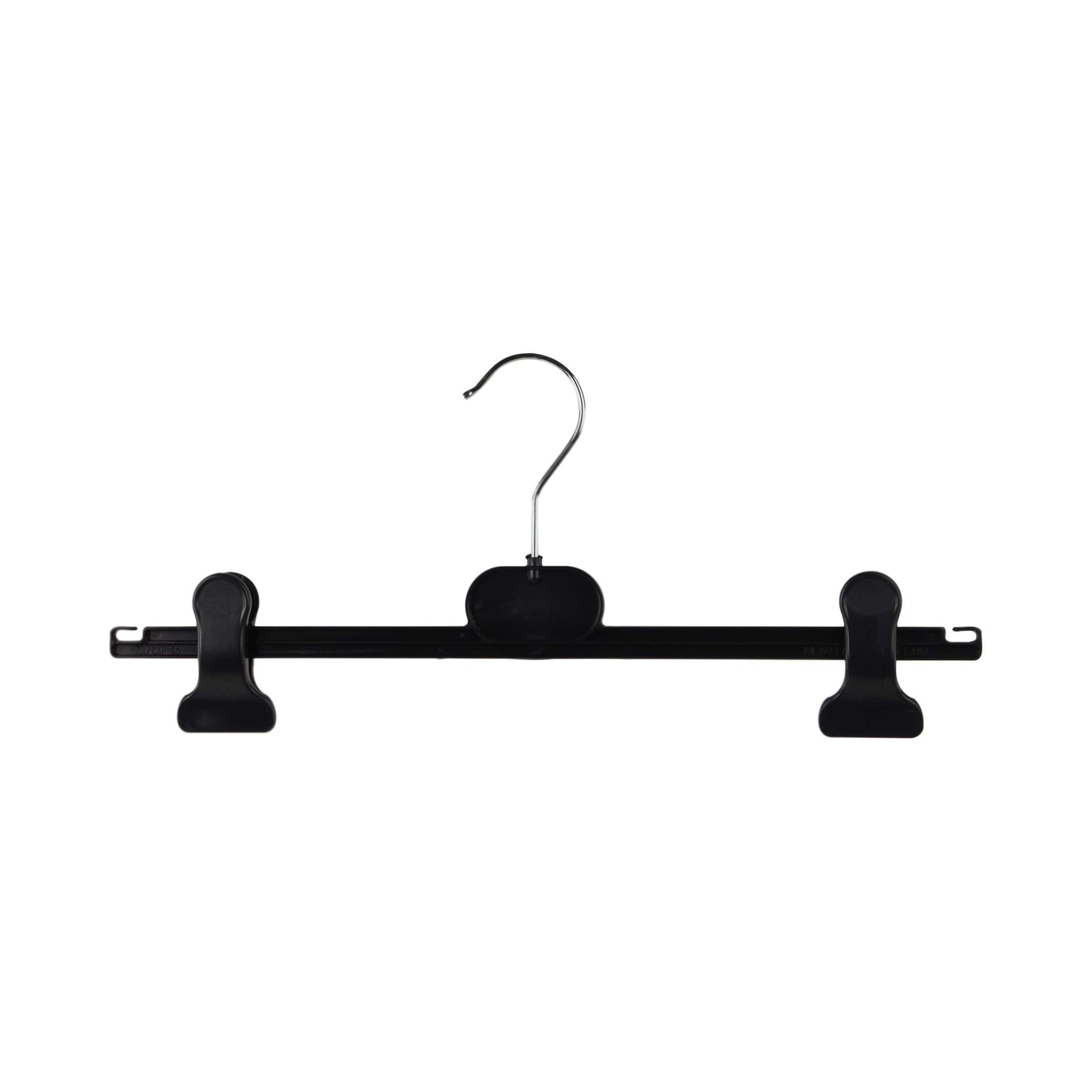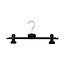 Deze zwarte kunststof kleerhanger beschikt over twee handige klemmen en over inkepingen. Dit maakt de hanger geschikt om broeken aan op te hangen, maar ook jurkjes kunnen eraan worden gehangen. De klemmen hebben een rubberen knijpvlak, dit zorgt voor extra grip op uw kleding. Tevens zijn de klemmen uitschuifbaar. De kledinghanger is 36 cm in de breedte. De kostprijs per stuk bedraagt 25 cent. Veel functionaliteit dus voor weinig!